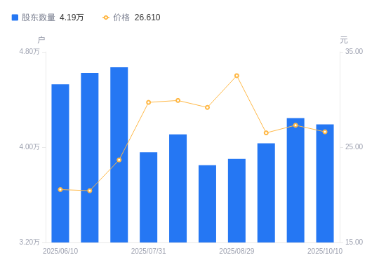 近一年(2024年10月10日至2025年10月10日),锐科激光A股股东户数从3.91万户,增加至4.19万户,增幅7.16%,区间股价上涨39.54%。