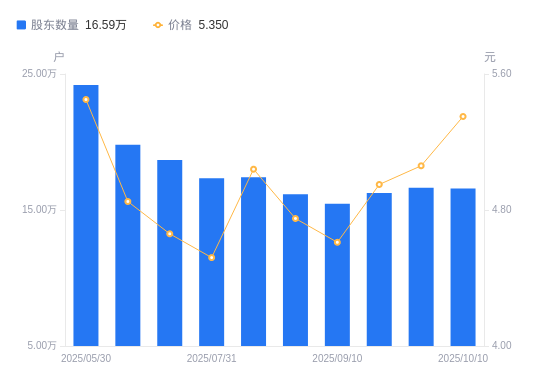 10月10日消息,数据显示,截至2025年9月30日,中超控股A股股东总户数为16.64万户,较上期(2025年9月19日)增加3950户,增幅2.43%。公司最新A股总股本为13.69亿股,其中流通A股13.05亿股,户均持有流通A股数量为7843股,较上期减少190.72股,降幅2.37%;户均持流通A股市值3.97万元,较上期减少81.31元,降幅0.20%。