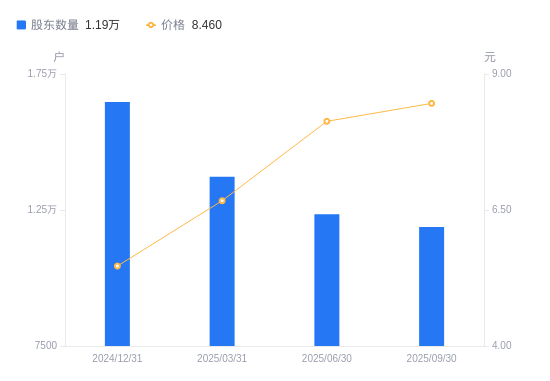 近一年(2024年9月30日至2025年9月30日),我乐家居A股股东户数从1.65万户,减低至1.19万户,降幅27.96%,区间股价上涨44.62%。