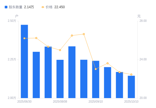 近一年(2024年10月10日至2025年10月10日),中科江南A股股东户数从2.54万户,减低至2.14万户,降幅15.66%,区间股价下跌36.62%。