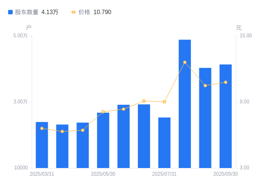 10月9日消息,数据显示,截至2025年9月30日,翔鹭钨业A股股东总户数为4.13万户,较上期(2025年9月19日)增加1026户,增幅2.54%。公司最新A股总股本为3.27亿股,其中流通A股2.68亿股,户均持有流通A股数量为6493.07股,较上期减少165.23股,降幅2.48%;户均持流通A股市值7.01万元,较上期增加214.71元,增幅0.31%。