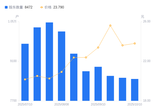 近一年(2024年12月31日至2025年10月10日),开润股份A股股东户数从1.07万户,减低至8472户,降幅20.59%,区间股价下跌0.42%。