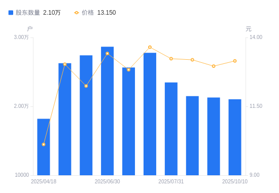 近一年(2024年10月10日至2025年10月10日),狄耐克A股股东户数从1.83万户,增加至2.1万户,增幅14.89%,区间股价上涨20.86%。
