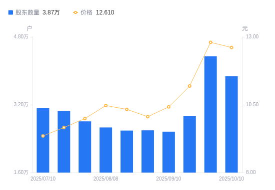 10月14日消息,数据显示,截至2025年10月10日,东华科技A股股东总户数为3.87万户,较上期(2025年9月30日)减少4700户,降幅10.83%。公司最新A股总股本为7.08亿股,其中流通A股5.43亿股,户均持有流通A股数量为1.4万股,较上期增加1520.72股,增幅12.14%;户均持流通A股市值17.71万元,较上期增加1.68万元,增幅10.48%。