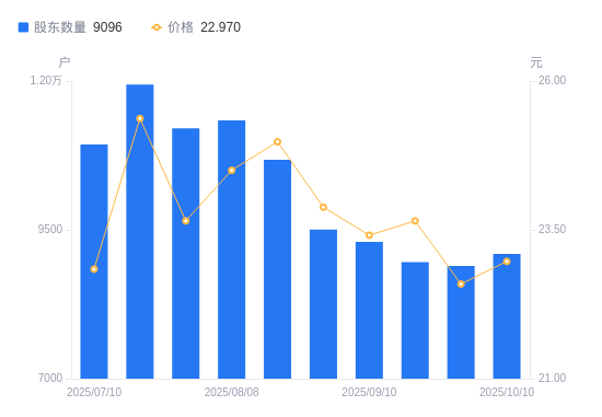 近一年(2024年10月18日至2025年10月10日),金道科技A股股东户数从8554户,增加至9096户,增幅6.34%,区间股价上涨56.00%。