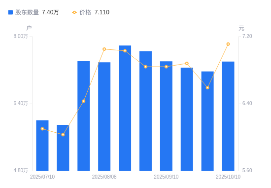 近一年(2024年10月10日至2025年10月10日),西部建设A股股东户数从6.18万户,增加至7.4万户,增幅19.77%,区间股价上涨14.77%。