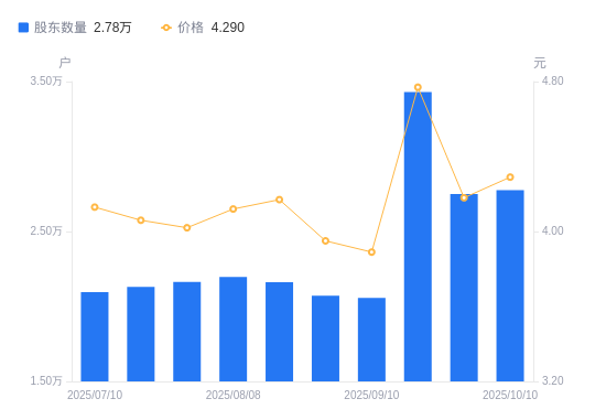 近一年(2024年10月10日至2025年10月10日),新宁物流A股股东户数从1.85万户,增加至2.78万户,增幅49.87%,区间股价上涨68.24%。
