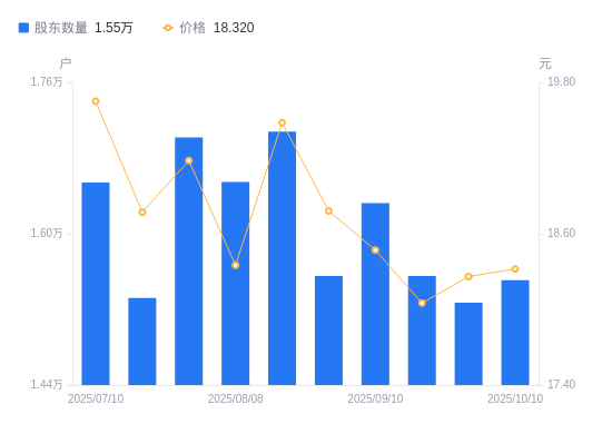 近一年(2024年10月18日至2025年10月10日),双象股份A股股东户数从1.93万户,减低至1.55万户,降幅19.66%,区间股价上涨28.56%。