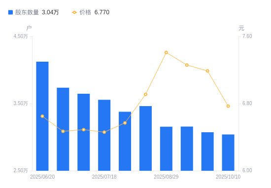 近一年(2024年10月10日至2025年10月10日),超频三A股股东户数从3.83万户,减低至3.04万户,降幅20.72%,区间股价上涨1.96%。