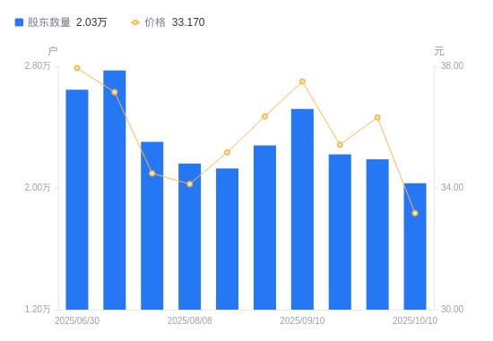 10月14日消息,数据显示,截至2025年10月10日,领湃科技A股股东总户数为2.03万户,较上期(2025年9月30日)减少1570户,降幅7.18%。公司最新A股总股本为1.72亿股,其中流通A股1.58亿股,户均持有流通A股数量为7793.14股,较上期增加559.3股,增幅7.73%;户均持流通A股市值25.85万元,较上期减少4234.64元,降幅1.61%。