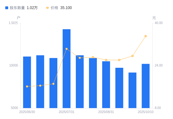 近一年(2024年10月18日至2025年10月10日),金春股份A股股东户数从1.06万户,减低至1.02万户,降幅4.19%,区间股价上涨176.31%。