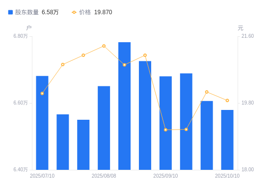 近一年(2024年10月10日至2025年10月10日),航发控制A股股东户数从5.67万户,增加至6.58万户,增幅16.11%,区间股价下跌9.30%。
