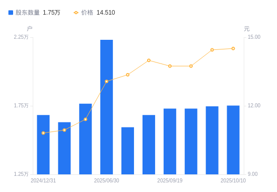 近一年(2024年12月31日至2025年10月10日),金徽股份A股股东户数从1.68万户,增加至1.75万户,增幅4.08%,区间股价上涨30.72%。