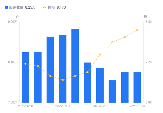近一年(2024年12月31日至2025年10月10日),天顺风能A股股东户数从8.4万户,减低至8.25万户,降幅1.78%,区间股价上涨7.22%。