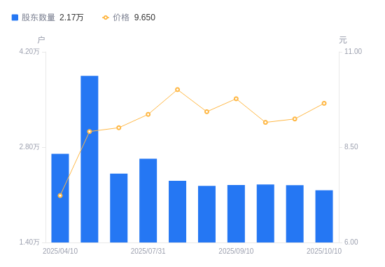 近一年(2024年10月10日至2025年10月10日),麦趣尔A股股东户数从2.4万户,减低至2.17万户,降幅9.68%,区间股价上涨48.92%。