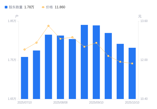 近一年(2024年10月18日至2025年10月10日),亨迪药业A股股东户数从1.85万户,减低至1.78万户,降幅3.92%,区间股价上涨8.02%。