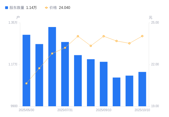 近一年(2024年10月10日至2025年10月10日),未来电器A股股东户数从1.21万户,减低至1.14万户,降幅5.86%,区间股价上涨14.15%。