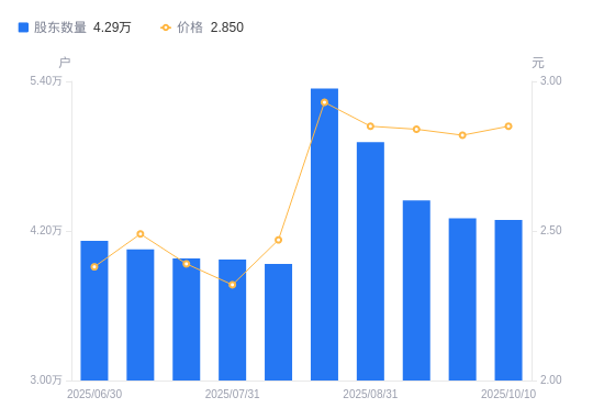 近一年(2024年12月31日至2025年10月10日),康欣新材A股股东户数从4.14万户,增加至4.29万户,增幅3.50%,区间股价上涨34.43%。