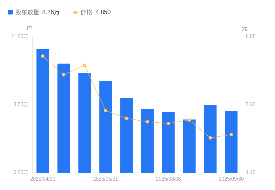 10月15日消息,数据显示,截至2025年9月19日,广安爱众A股股东总户数为8.49万户,较上期(2025年8月20日)增加5285户,增幅6.64%。公司最新A股总股本为12.62亿股,其中流通A股12.32亿股,户均持有流通A股数量为1.45万股,较上期减少964.28股,降幅6.23%;户均持流通A股市值6.98万元,较上期减少7889.91元,降幅10.15%。