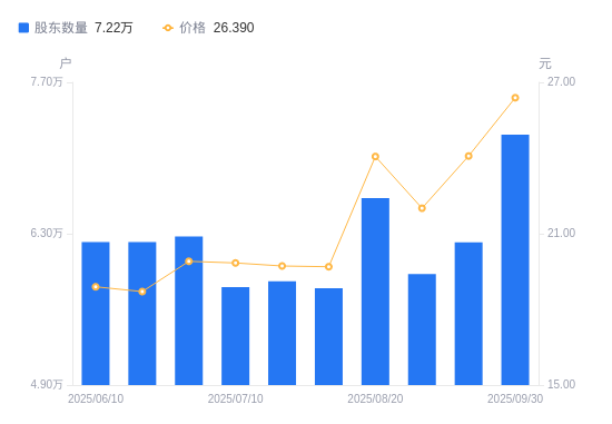 近一年(2024年9月30日至2025年9月30日),飞凯材料A股股东户数从4.63万户,增加至7.22万户,增幅55.76%,区间股价上涨114.29%。