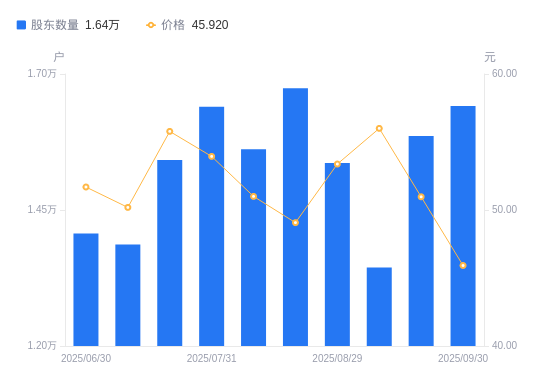 近一年(2024年9月30日至2025年9月30日),新诺威A股股东户数从1.49万户,增加至1.64万户,增幅10.08%,区间股价上涨64.12%。