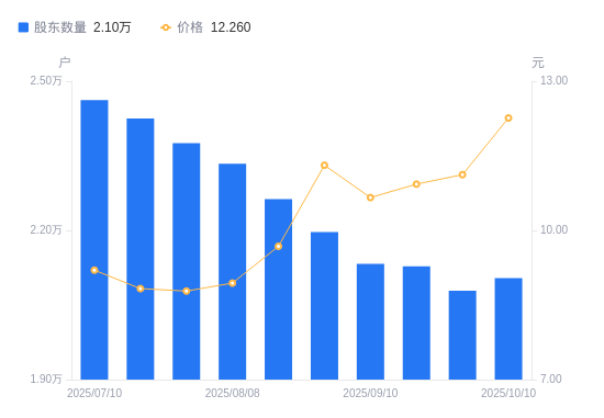 10月14日消息,数据显示,截至2025年10月10日,*ST国华A股股东总户数为2.1万户,较上期(2025年9月30日)增加255户,增幅1.23%。公司最新A股总股本为1.32亿股,其中流通A股1.26亿股,户均持有流通A股数量为6001.99股,较上期减少73.63股,降幅1.21%;户均持流通A股市值7.36万元,较上期增加6023.48元,增幅8.92%。