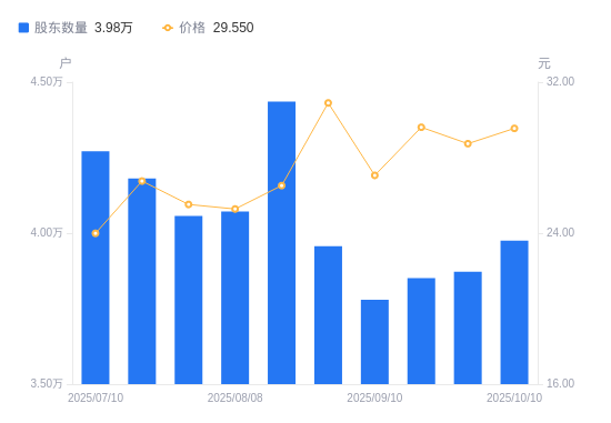 近一年(2024年10月10日至2025年10月10日),电科数字A股股东户数从3.17万户,增加至3.98万户,增幅25.31%,区间股价上涨38.28%。