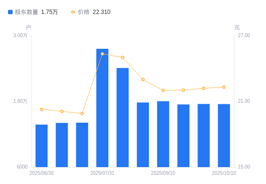 近一年(2024年10月10日至2025年10月10日),彩虹集团A股股东户数从1.6万户,增加至1.75万户,增幅9.33%,区间股价上涨30.85%。