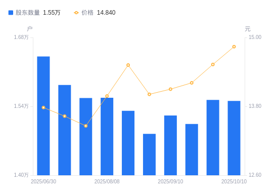 10月15日消息,数据显示,截至2025年10月10日,友讯达A股股东总户数为1.55万户,较上期(2025年9月30日)减少20户,降幅0.13%。公司最新A股总股本为2亿股,其中流通A股1.6亿股,户均持有流通A股数量为1.03万股,较上期增加13.31股,增幅0.13%;户均持流通A股市值15.33万元,较上期增加3396.44元,增幅2.27%。