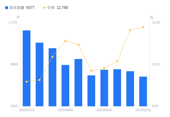 近一年(2024年10月18日至2025年10月10日),森赫股份A股股东户数从1.18万户,减低至9377户,降幅20.54%,区间股价上涨65.46%。