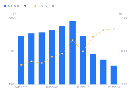 近一年(2024年10月10日至2025年10月10日),英华特A股股东户数从6505户,减低至5695户,降幅12.45%,区间股价上涨42.08%。