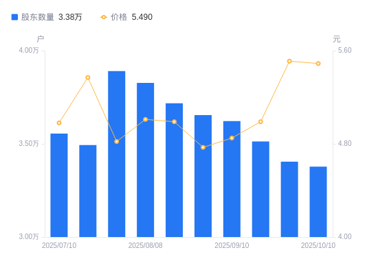 近一年(2024年10月10日至2025年10月10日),欣龙控股A股股东户数从3.69万户,减低至3.38万户,降幅8.34%,区间股价上涨48.78%。