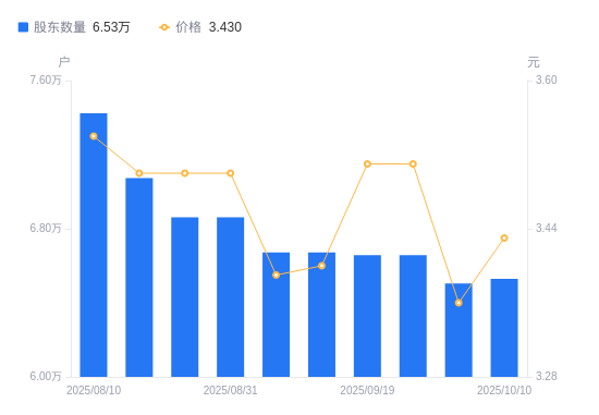 近一年(2024年10月10日至2025年10月10日),淮河能源A股股东户数从3.22万户,增加至6.53万户,增幅102.97%,区间股价下跌4.46%。