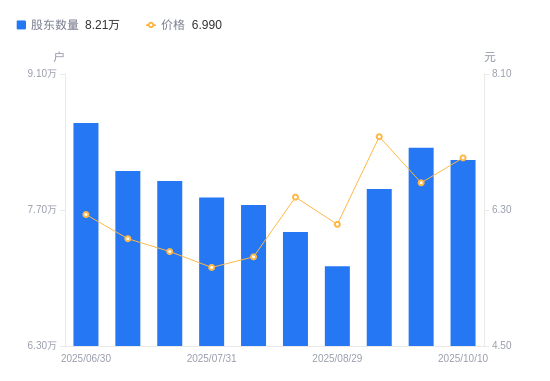 近一年(2024年10月10日至2025年10月10日),宝馨科技A股股东户数从7.74万户,增加至8.21万户,增幅6.07%,区间股价上涨34.17%。