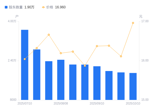 近一年(2024年10月10日至2025年10月10日),宝鼎科技A股股东户数从1.88万户,增加至1.9万户,增幅0.73%,区间股价上涨40.63%。