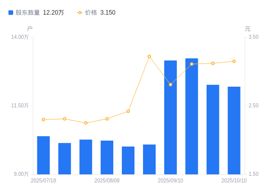近一年(2024年10月10日至2025年10月10日),兆新股份A股股东户数从11.43万户,增加至12.2万户,增幅6.74%,区间股价上涨60.71%。