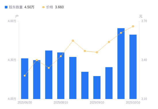 近一年(2024年10月10日至2025年10月10日),阳光照明A股股东户数从3.84万户,增加至4.5万户,增幅17.09%,区间股价上涨34.07%。
