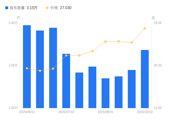 近一年(2024年10月10日至2025年10月10日),杭氧股份A股股东户数从2.86万户,增加至3.15万户,增幅10.12%,区间股价上涨27.32%。