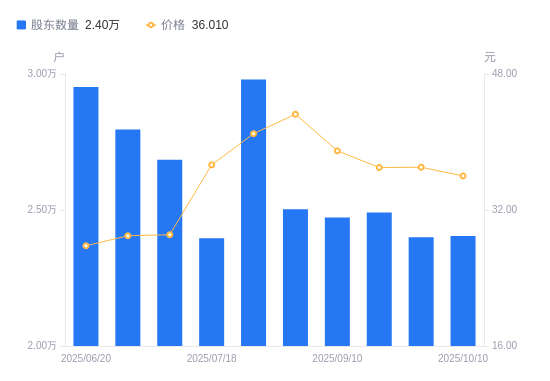 近一年(2024年10月10日至2025年10月10日),康弘药业A股股东户数从3.22万户,减低至2.4万户,降幅25.30%,区间股价上涨74.13%。