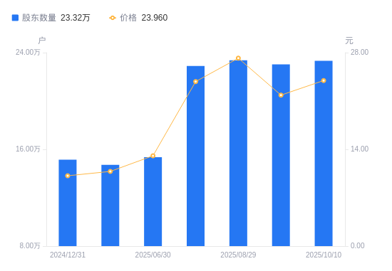 近一年(2024年12月31日至2025年10月10日),盛和资源A股股东户数从15.15万户,增加至23.32万户,增幅53.94%,区间股价上涨126.89%。