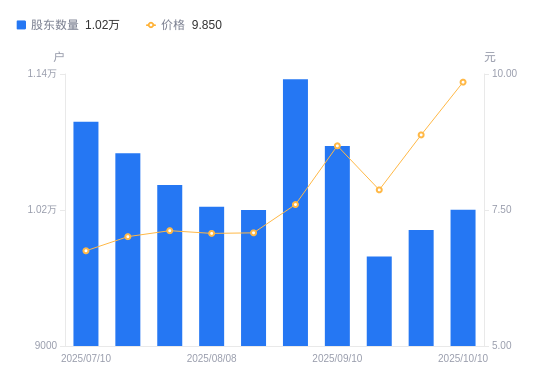 近一年(2024年10月10日至2025年10月10日),*ST聆达A股股东户数从1.64万户,减低至1.02万户,降幅37.71%,区间股价上涨53.19%。