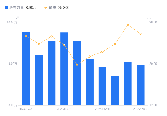 近一年(2024年9月30日至2025年9月30日),信维通信A股股东户数从9.49万户,减低至8.98万户,降幅5.34%,区间股价上涨29.84%。