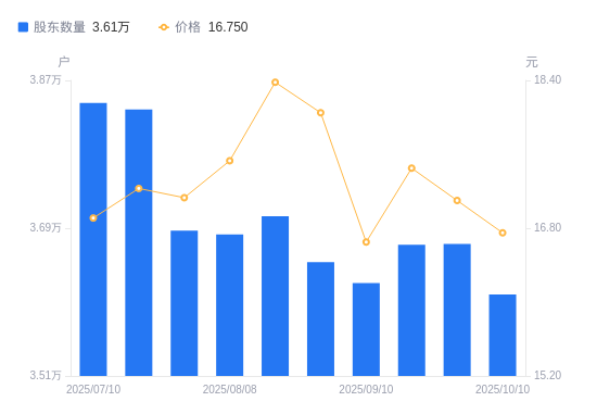 近一年(2024年10月10日至2025年10月10日),东软载波A股股东户数从2.85万户,增加至3.61万户,增幅26.52%,区间股价下跌0.53%。