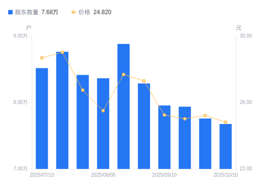 近一年(2024年10月10日至2025年10月10日),宇信科技A股股东户数从5.91万户,增加至7.68万户,增幅29.97%,区间股价上涨22.59%。