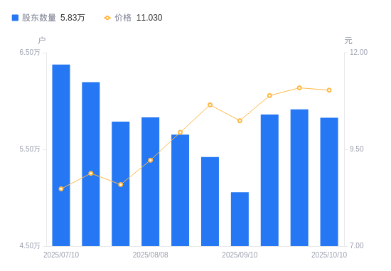 近一年(2024年10月10日至2025年10月10日),中原内配A股股东户数从5.01万户,增加至5.83万户,增幅16.43%,区间股价上涨85.07%。