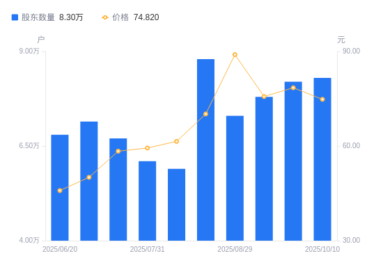 近一年(2024年10月10日至2025年10月10日),麦格米特A股股东户数从2.2万户,增加至8.3万户,增幅277.27%,区间股价上涨165.79%。
