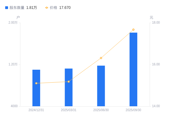 10月17日消息,数据显示,截至2025年9月30日,国机通用A股股东总户数为1.81万户,较上期(2025年6月30日)增加6313户,增幅53.57%。公司最新A股总股本为1.46亿股,其中流通A股1.46亿股,户均持有流通A股数量为8090.95股,较上期减少4334.54股,降幅34.88%;户均持流通A股市值14.3万元,较上期减少5.97万元,降幅29.45%。