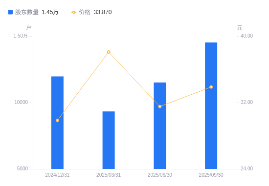 10月17日消息,数据显示,截至2025年9月30日,萤石网络A股股东总户数为1.45万户,较上期(2025年6月30日)增加3018户,增幅26.23%。公司最新A股总股本为7.88亿股,其中流通A股4.09亿股,户均持有流通A股数量为2.82万股,较上期减少7396.57股,降幅20.78%;户均持流通A股市值95.5万元,较上期减少16.69万元,降幅14.87%。