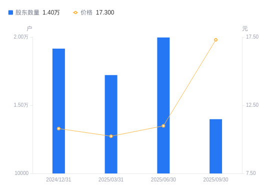 近一年(2024年9月30日至2025年9月30日),神通科技A股股东户数从1.88万户,减低至1.4万户,降幅25.80%,区间股价上涨93.73%。