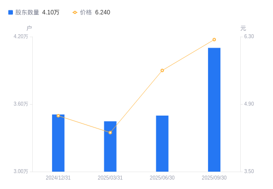近一年(2024年9月30日至2025年9月30日),沃华医药A股股东户数从3.74万户,增加至4.1万户,增幅9.59%,区间股价上涨50.36%。